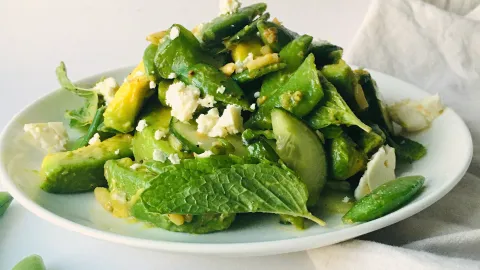Ingredients 10 ounces (about 283g) snow peas, thinly sliced lengthwise 2 medium avocados, thinly sliced or cut into chunks 2 stalks celery, thinly