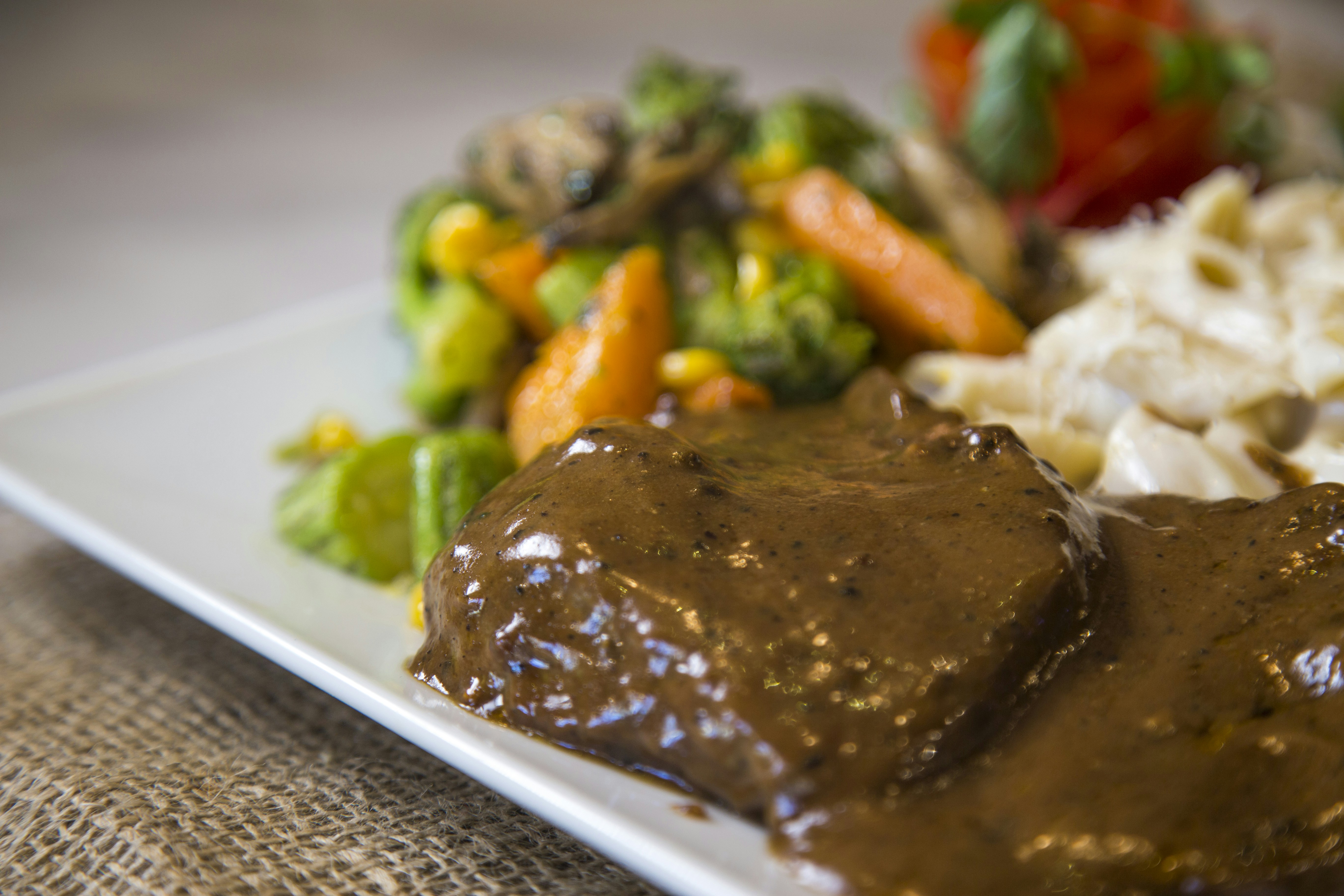 Step 7: Fluff the rice with a fork, and place a serving on each plate. Ladle the beef and gravy over the rice for serving.