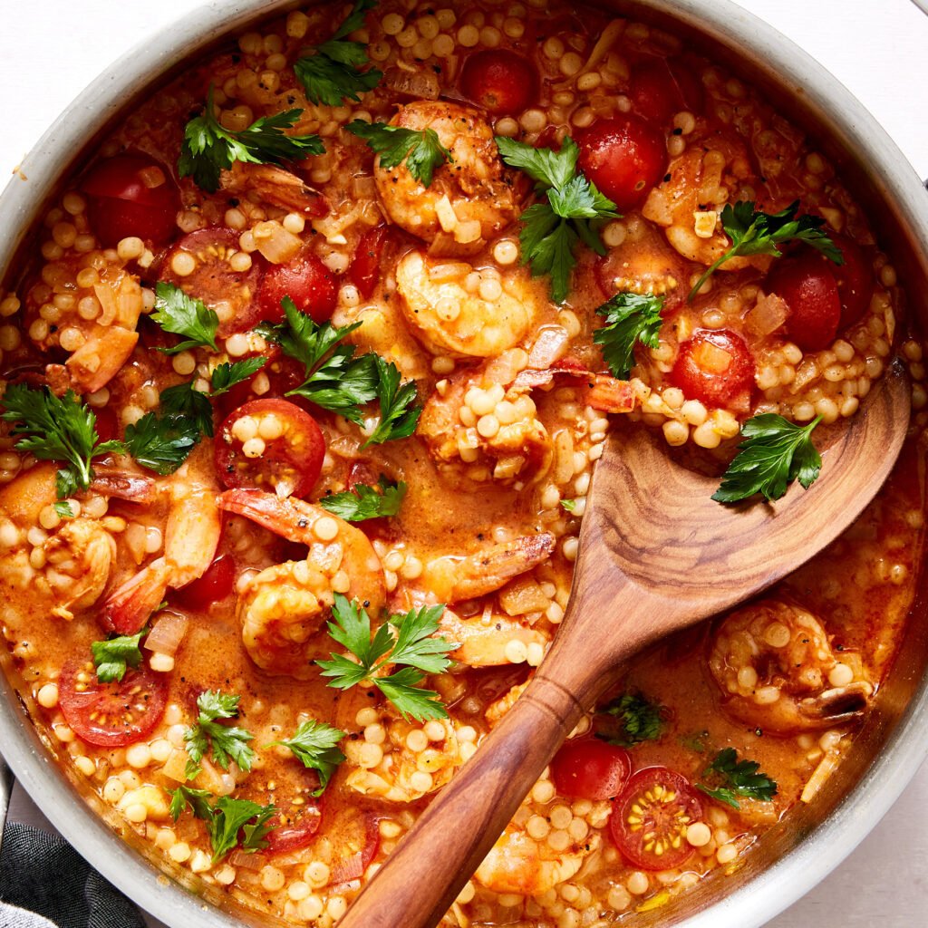 Combine cooked shrimp and tomatoes with couscous.