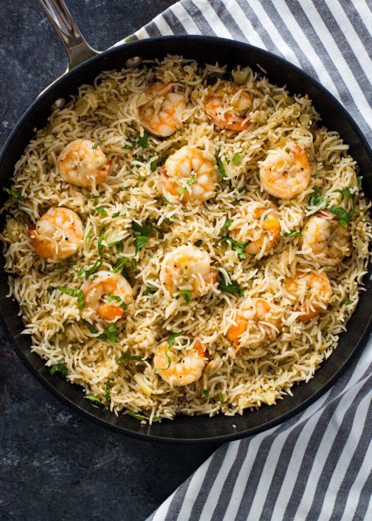 Place shrimp on top of the rice, cover, and cook for 5–6 minutes until shrimp are pink and cooked through.