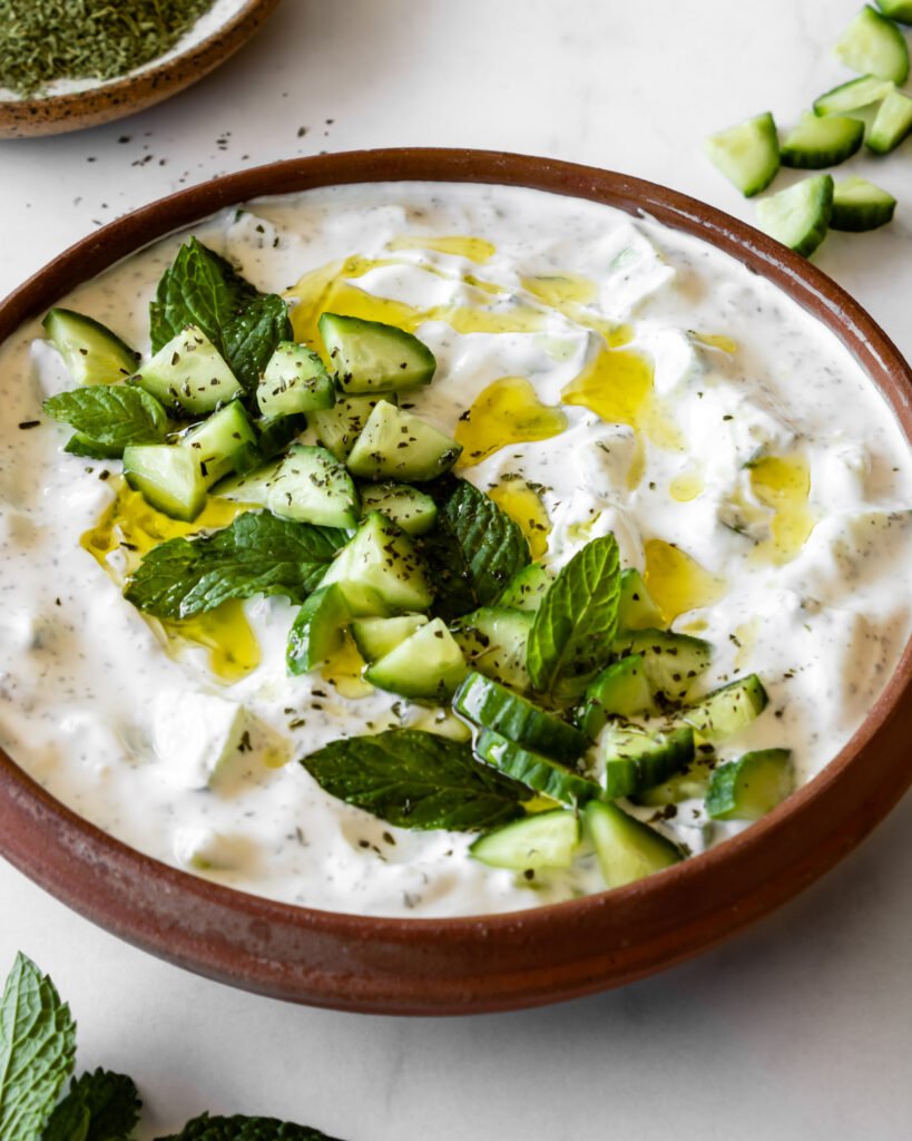 In a mixing bowl, add yogurt, cucumber, mint, lemon juice, garlic, salt, and pepper.