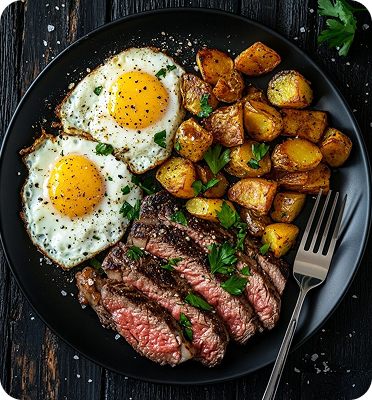 juicy, tender steak, golden crispy fried potatoes, and perfectly cooked eggs on your plate. Whether you’re gearing up for a busy day or enjoying a laid-back weekend brunch, this hearty meal hits all the right spots.
